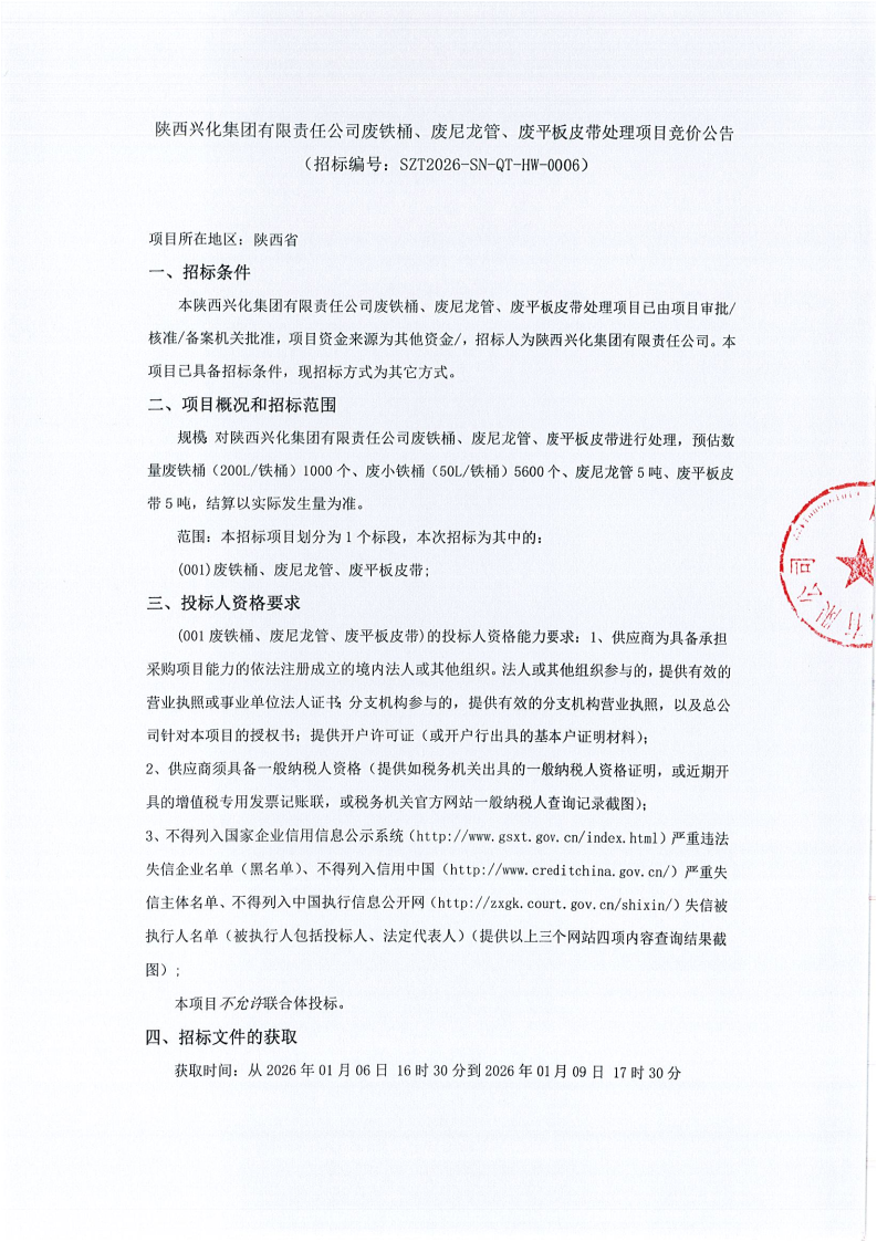 陕西兴化集团有限责任公司废铁桶、废尼龙管、废平板皮带处理项目竞价公告