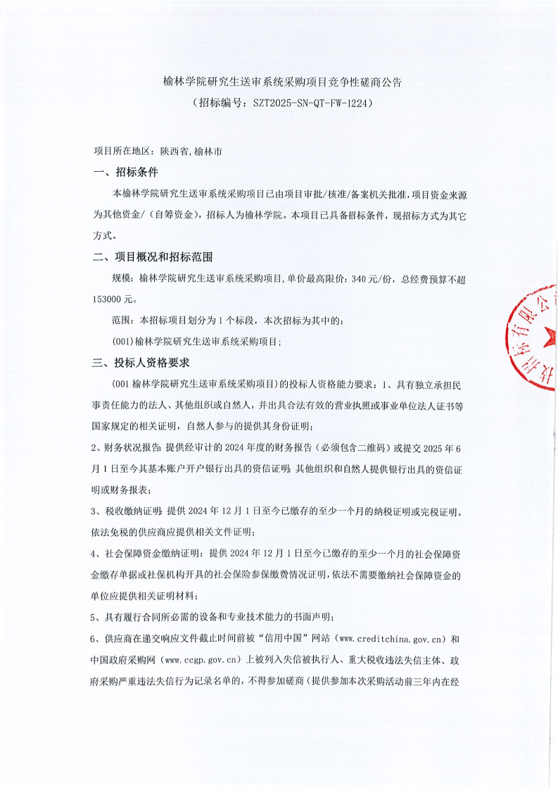 榆林学院研究生送审系统采购项目竞争性磋商公告
