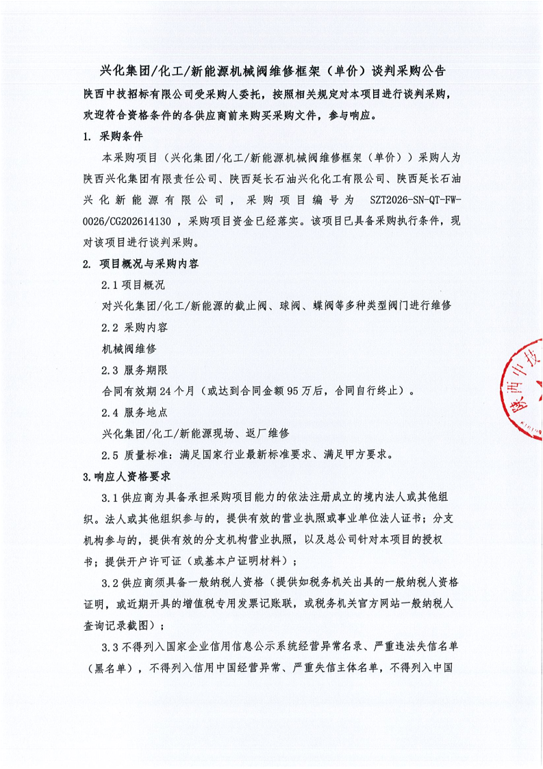 兴化集团、化工、新能源机械阀维修框架(单价)谈判采购公告