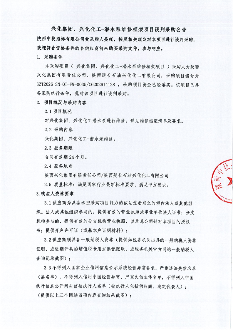 兴化集团、兴化化工-潜水泵维修框架项目谈判采购公告