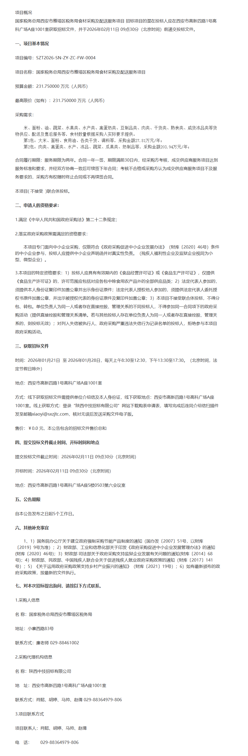 国家税务总局西安市雁塔区税务局食材采购及配送服务项目公开招标公告