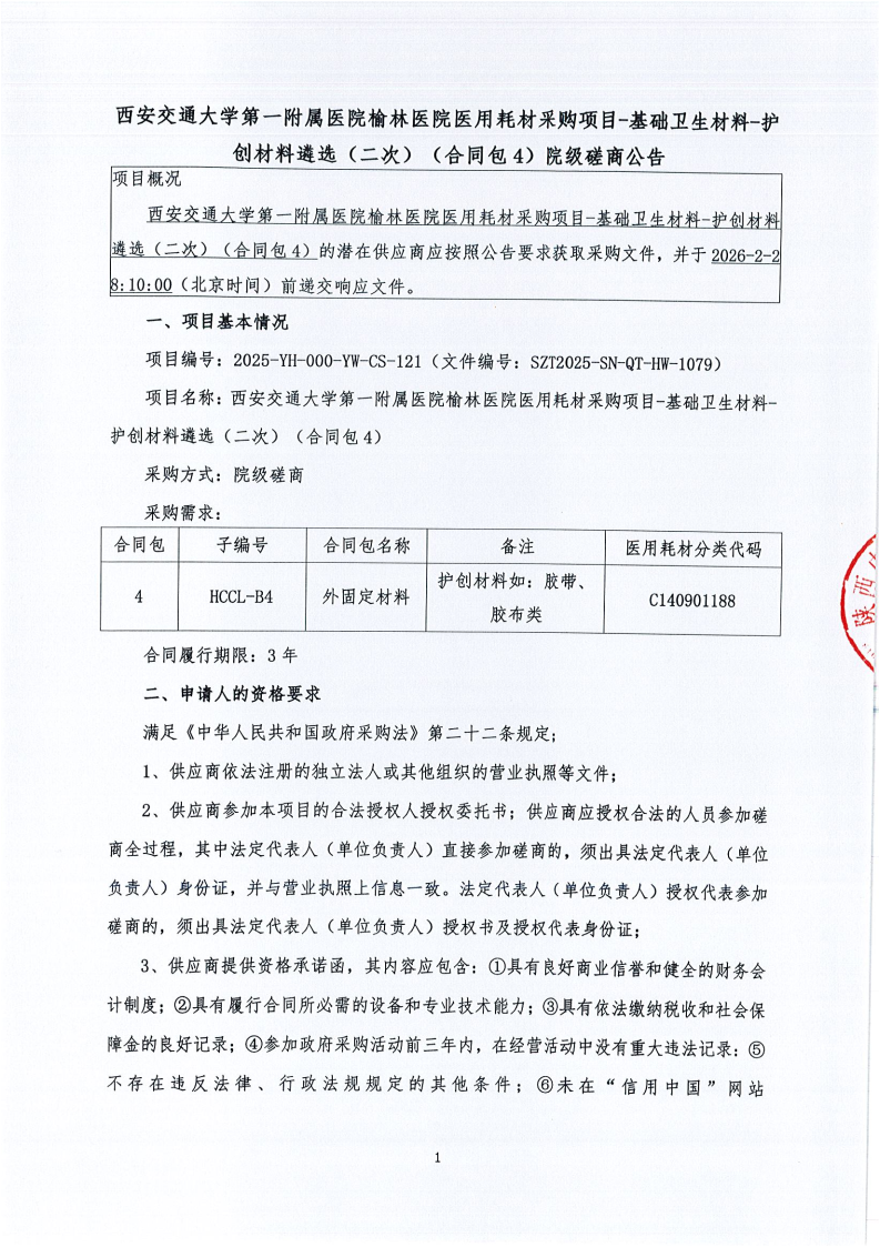 西安交通大学第一附属医院榆林医院医用耗材采购项目-基础卫生材料-护创材料遴选(二次)(合同包4)院级磋商公告