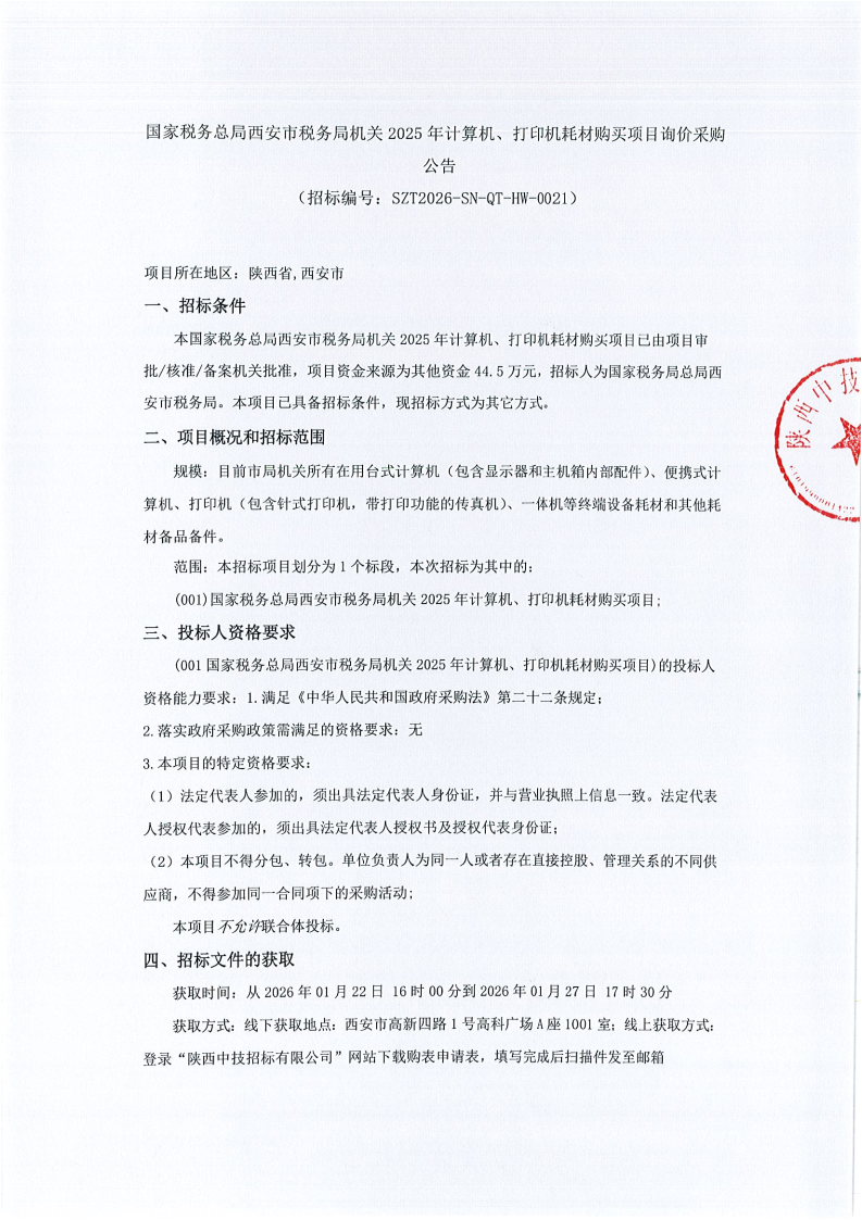 国家税务总局西安市税务局机关2025年计算机、打印机耗材购买项目询价采购公告