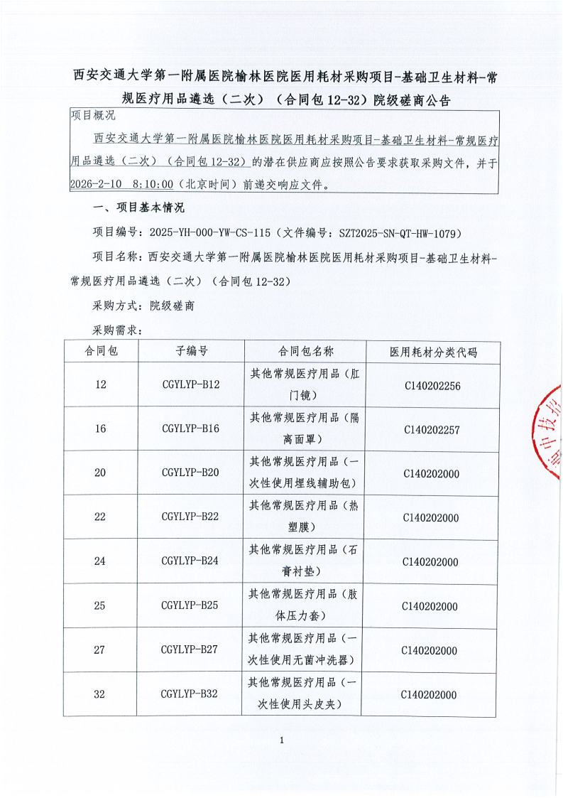 西安交通大学第一附属医院榆林医院医用耗材采购项目-基础卫生材料-常规医疗用品遴选(二次)(合同包12-32)院级磋商公告