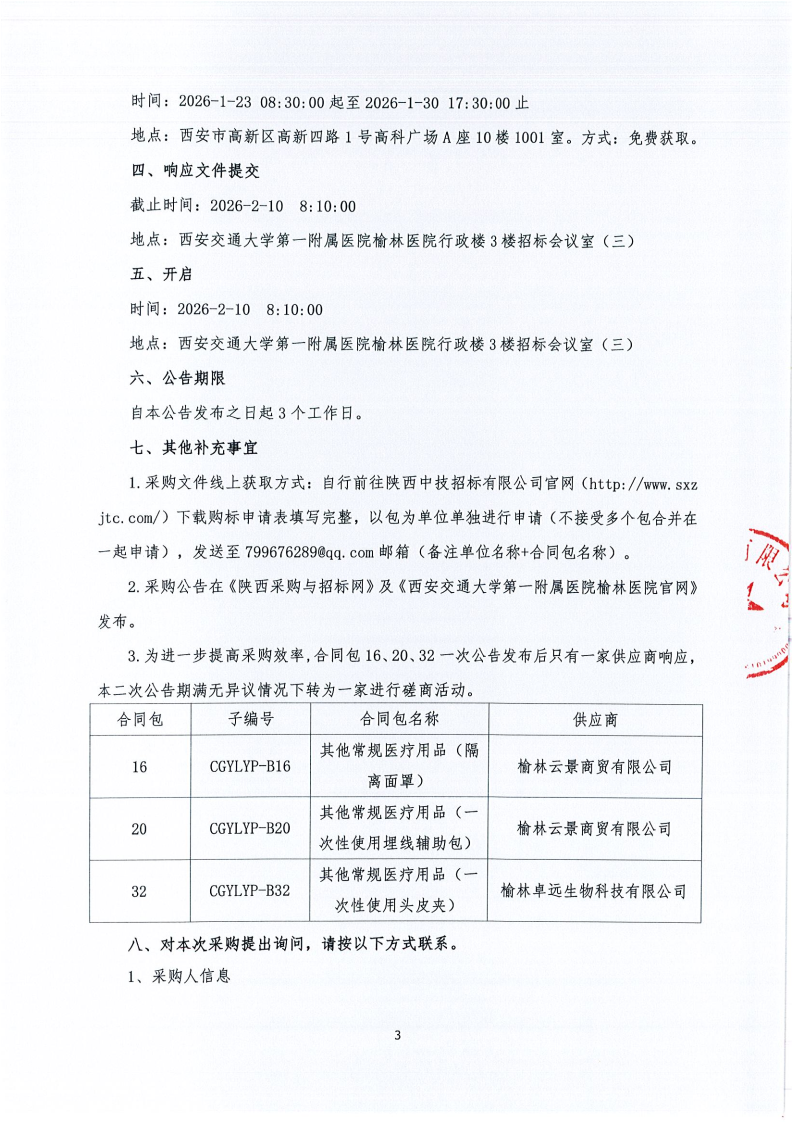 西安交通大学第一附属医院榆林医院医用耗材采购项目-基础卫生材料-避孕材料遴选(二次)(合同包1-3)院级磋商公告