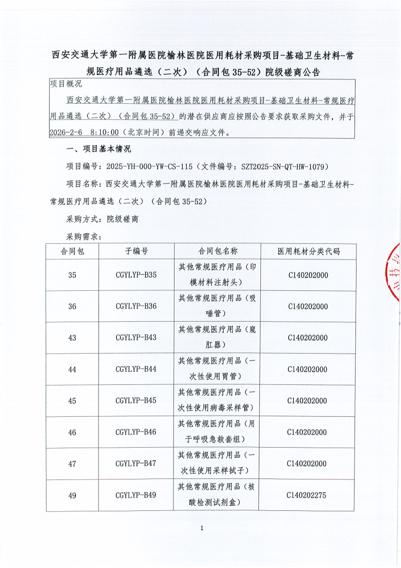 西安交通大学第一附属医院榆林医院医用耗材采购项目-基础卫生材料-常规医疗用品遴选(二次)(合同包35-52)院级磋商公告
