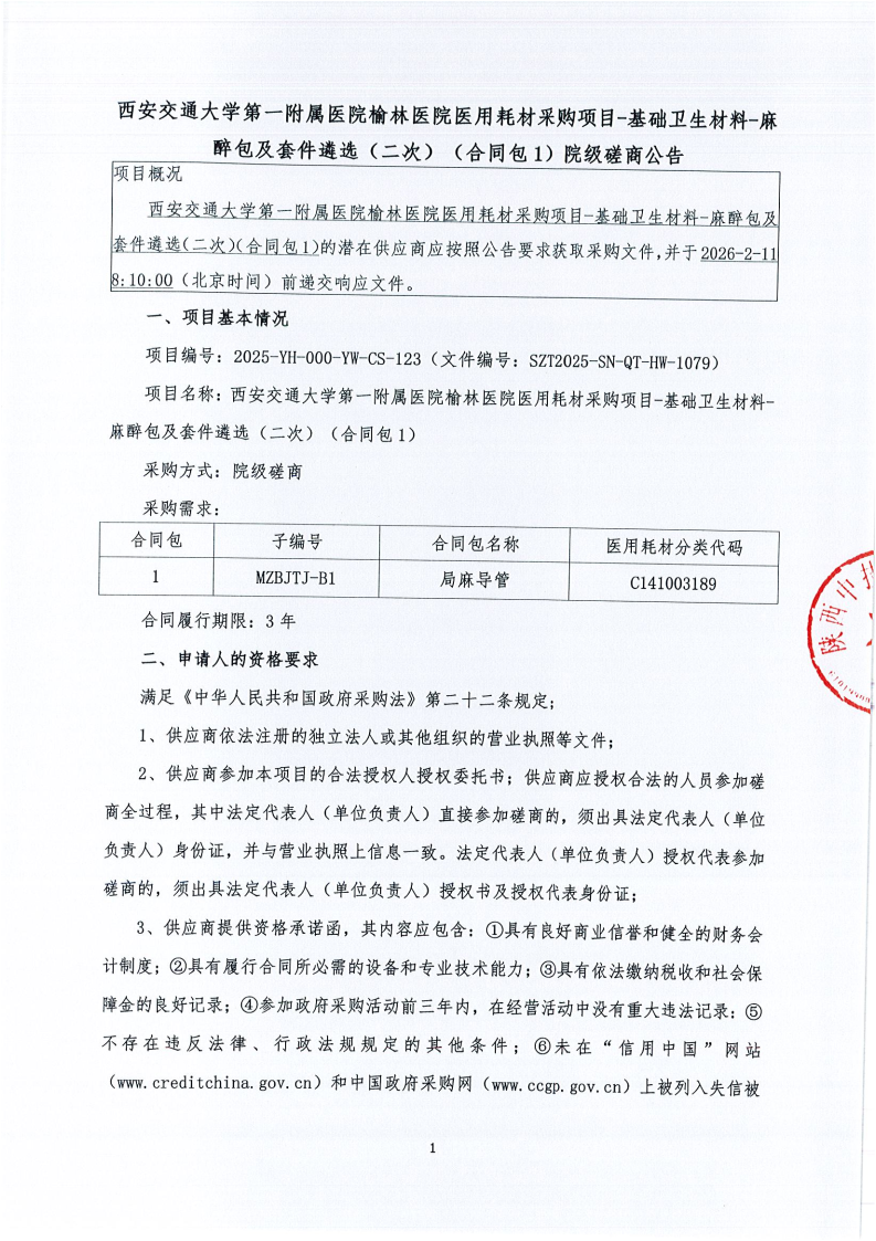 西安交通大学第一附属医院榆林医院医用耗材采购项目-基础卫生材料-麻醉包及套件遴选(二次)(合同包1)院级磋商公告