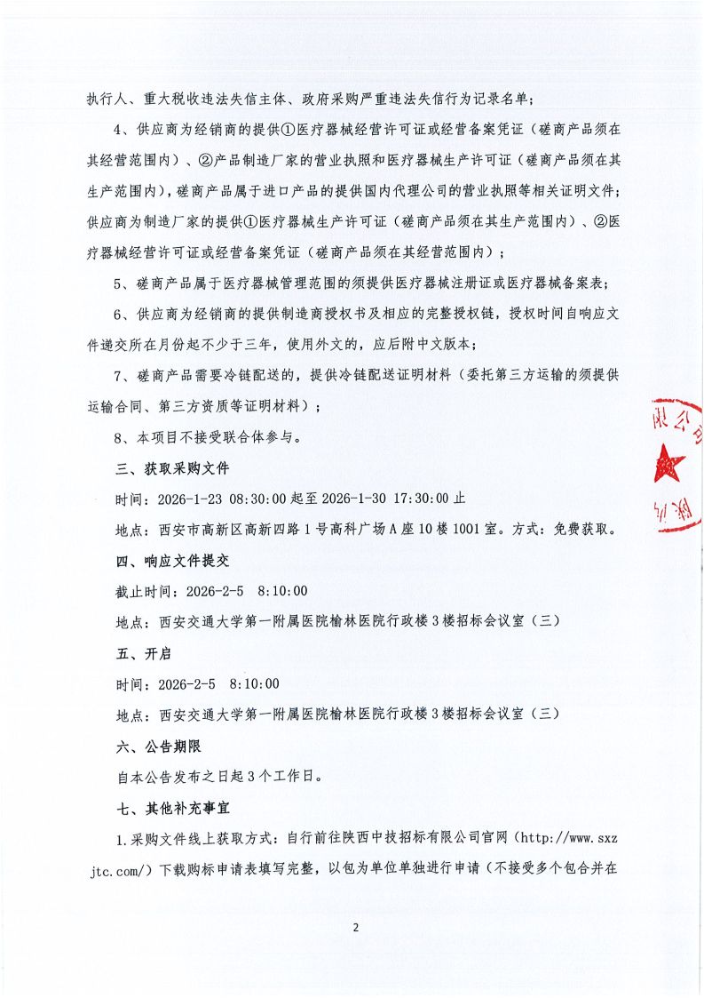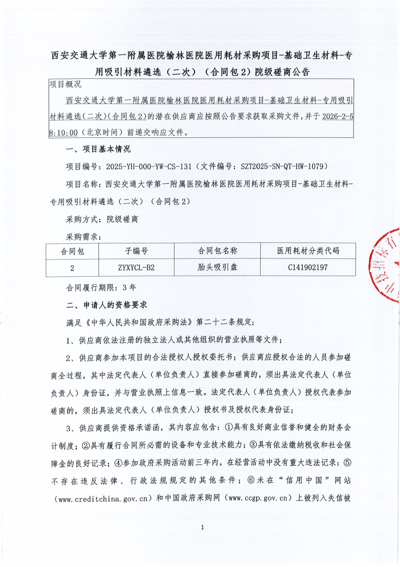 西安交通大学第一附属医院榆林医院医用耗材采购项目-基础卫生材料-专用吸引材料遴选(二次)(合同包2)院级磋商公告