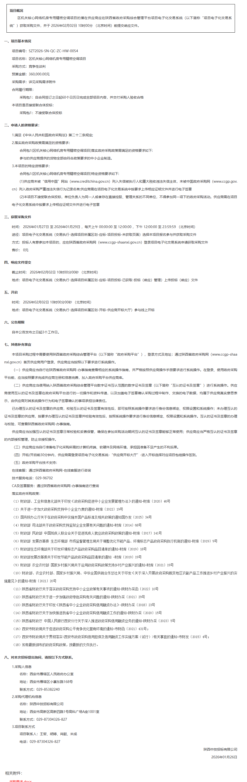 西安市雁塔区人民政府办公室区机关核心网络机房专用精密空调项目竞争性谈判公告