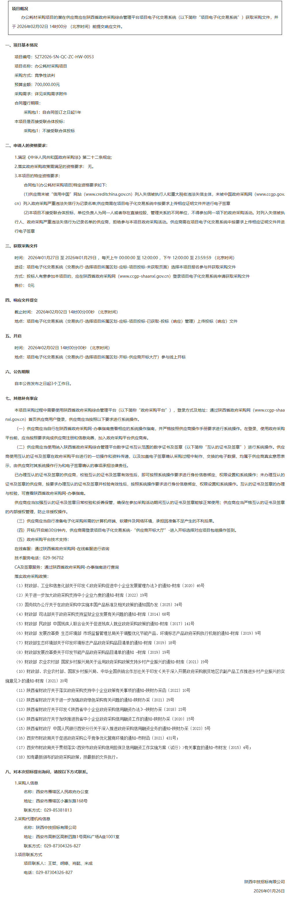 西安市雁塔区人民政府办公室办公耗材采购项目竞争性谈判公告