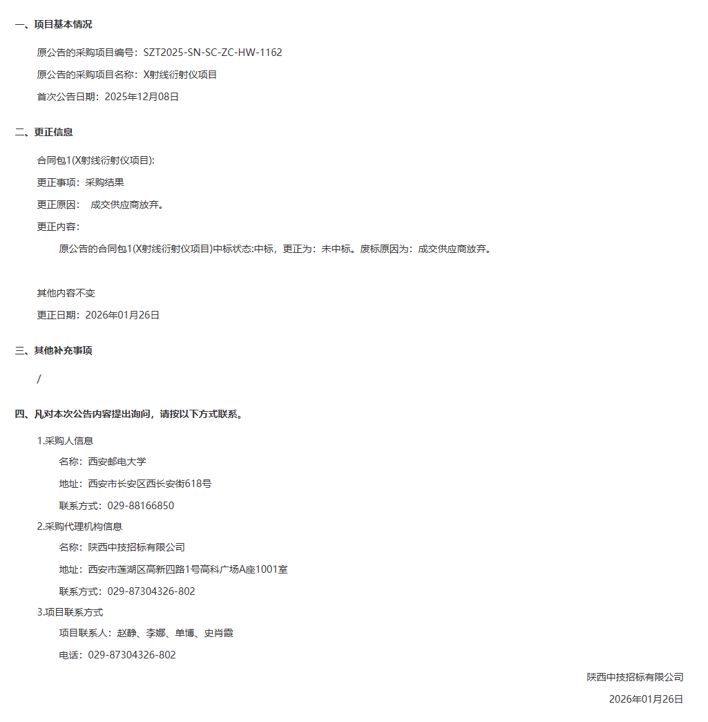 西安邮电大学X射线衍射仪项目结果更正公告(第一次)