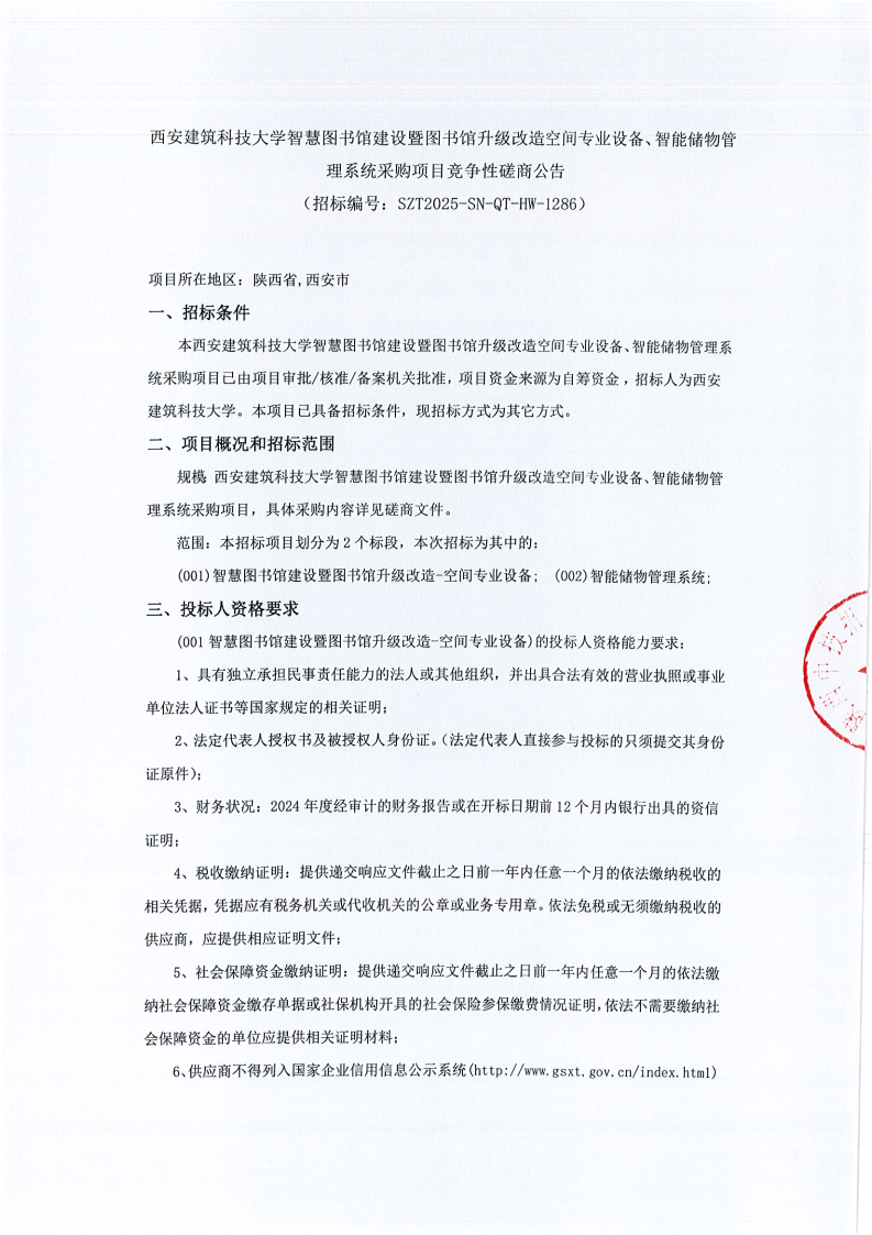 西安建筑科技大学智慧图书馆建设暨图书馆升级改造空间专业设备、智能储物管理系统采购项目竞争性磋商公告