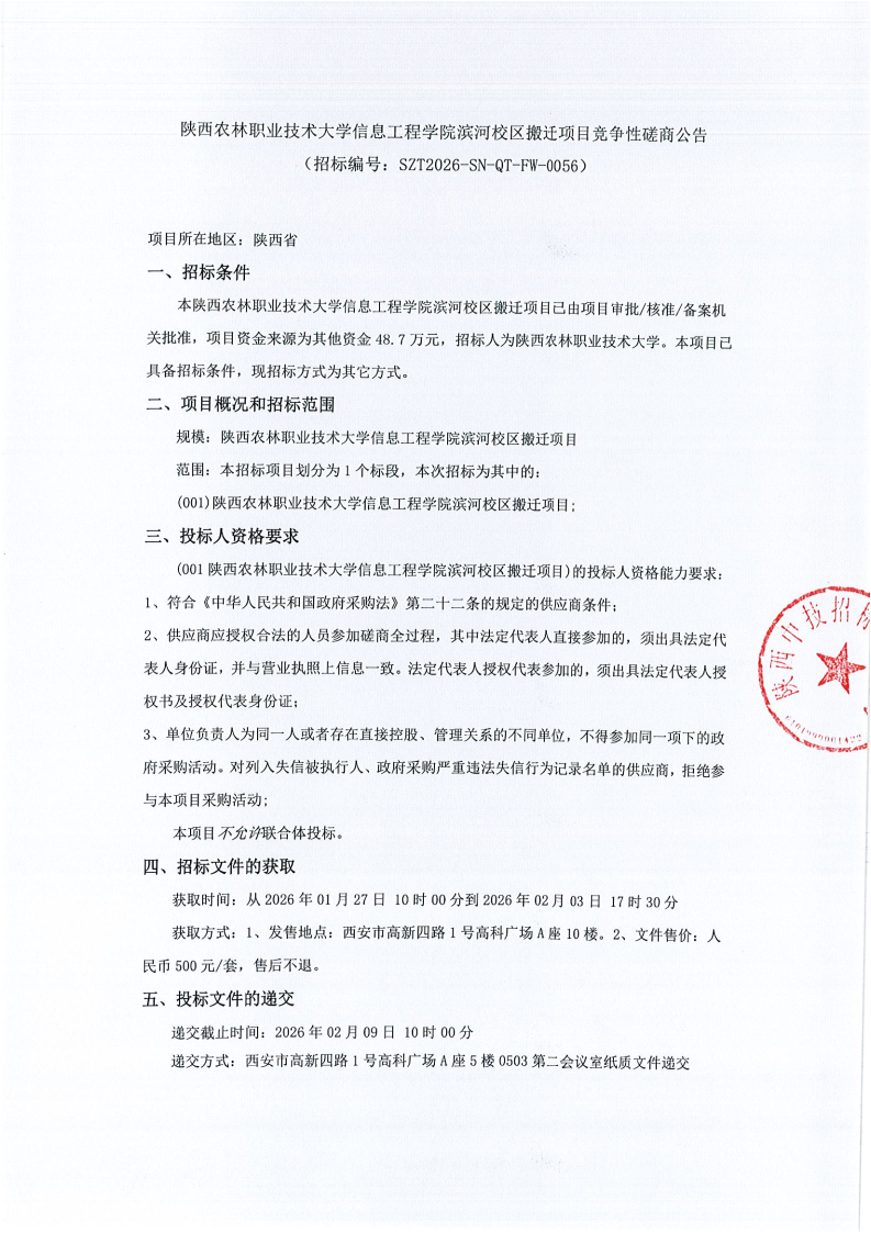 陕西农林职业技术大学信息工程学院滨河校区搬迁项目竞争性磋商公告
