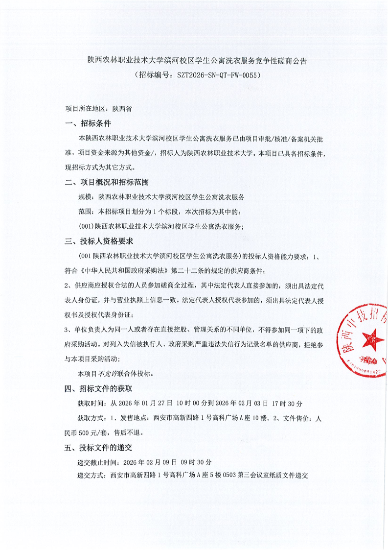 陕西农林职业技术大学滨河校区学生公寓洗衣服务竞争性磋商公告
