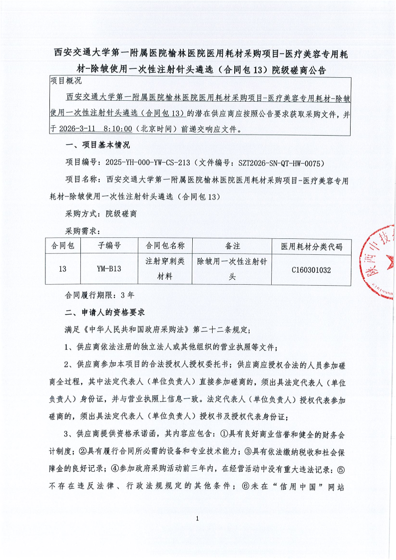 西安交通大学第一附属医院榆林医院医用耗材采购项目-医疗美容专用耗材-除皱使用一次性注射针头遴选(合同包13)院级磋商公告