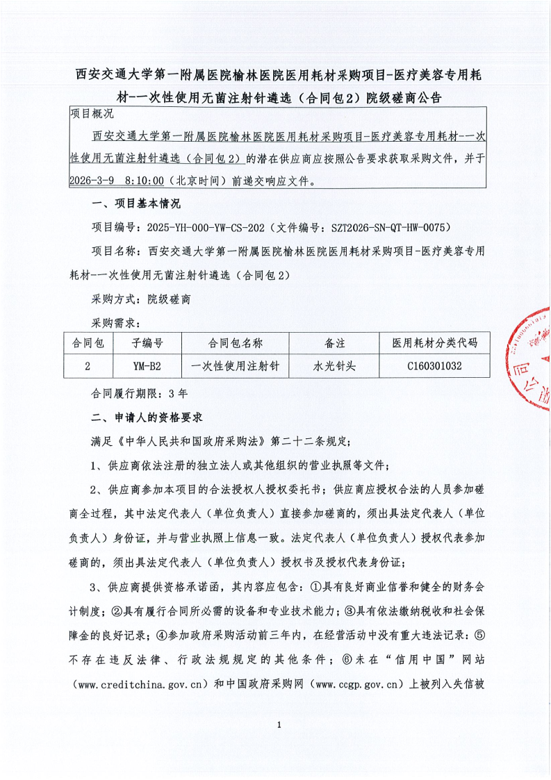 西安交通大学第一附属医院榆林医院医用耗材采购项目-医疗美容专用耗材-一次性使用无菌注射针遴选(合同包2)院级磋商公告