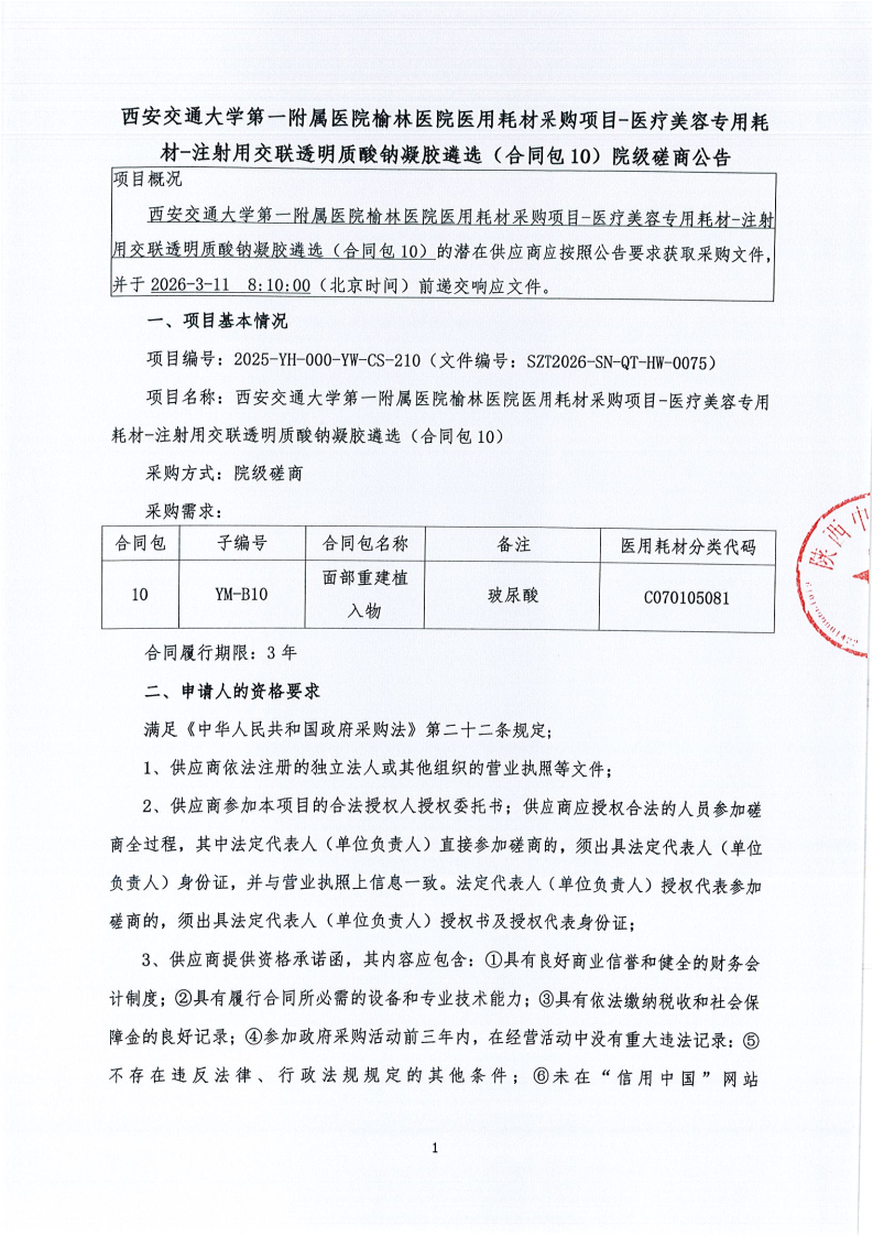 西安交通大学第一附属医院榆林医院医用耗材采购项目-医疗美容专用耗材-注射用交联透明质酸钠凝胶遴选(合同包10)院级磋商公告
