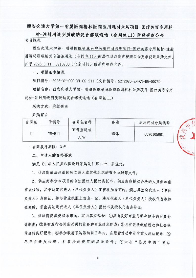 西安交通大学第一附属医院榆林医院医用耗材采购项目-医疗美容专用耗材-注射用透明质酸钠复合溶液遴选(合同包11)院级磋商公告