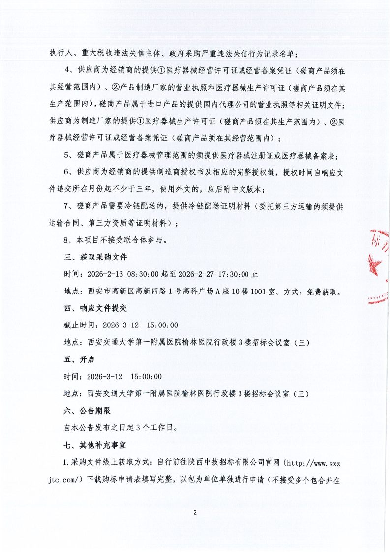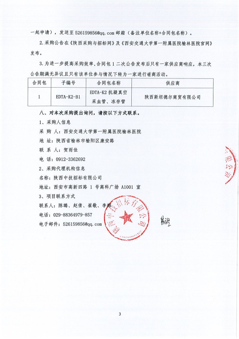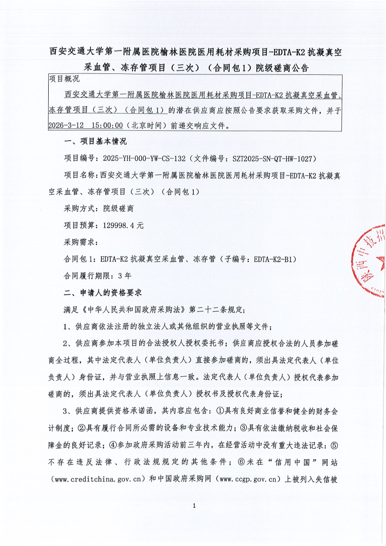 西安交通大学第一附属医院榆林医院医用耗材采购项目-EDTA-K2抗凝真空采血管、冻存管项目(三次)(合同包1)院级磋商公告