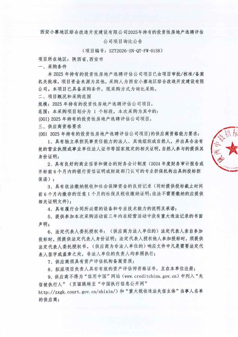 西安小寨地区综合改造开发建设有限公司2025年持有的投资性房地产选聘评估公司项目询比公告