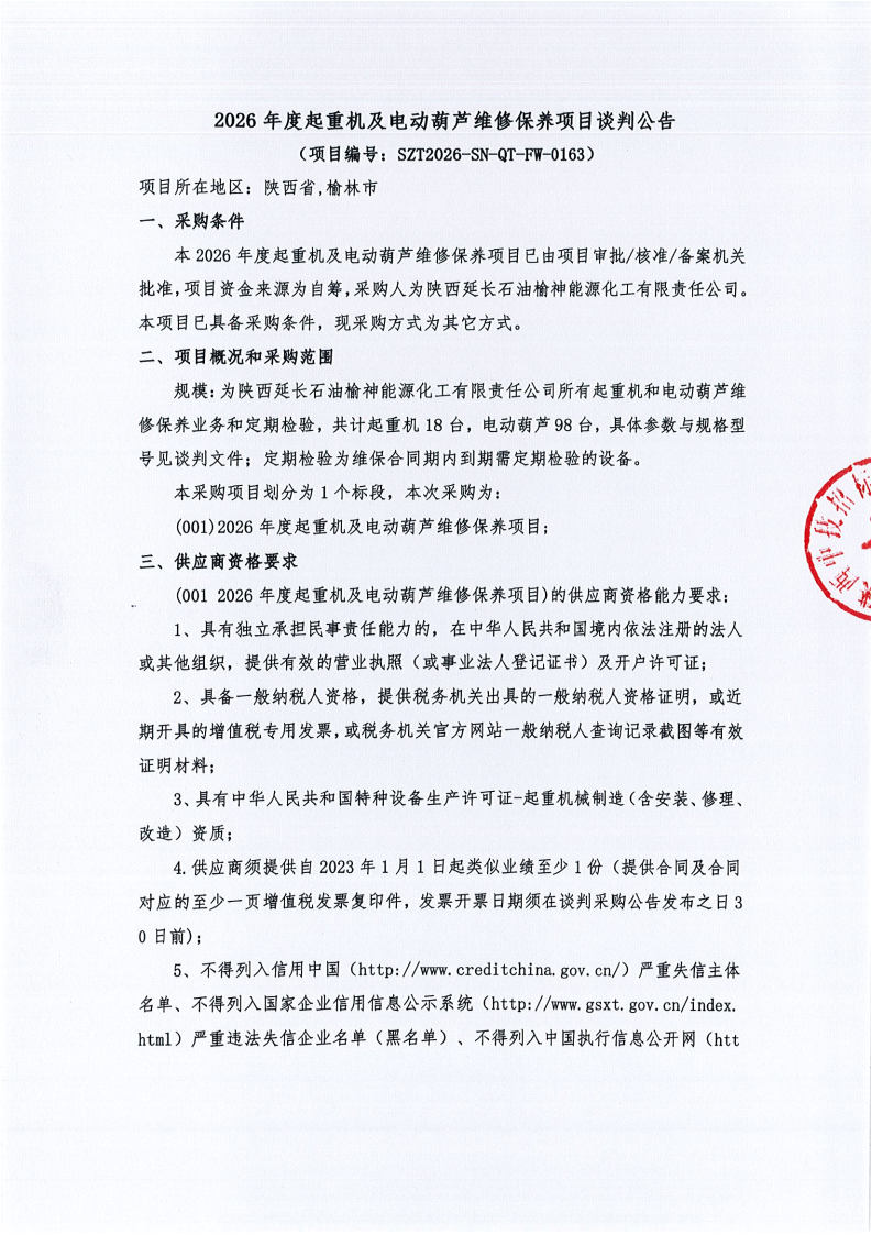 2026年度起重机及电动葫芦维修保养项目谈判公告