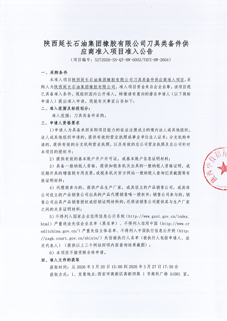 陕西延长石油集团橡胶有限公司刀具类备件供应商准入项目准入公告
