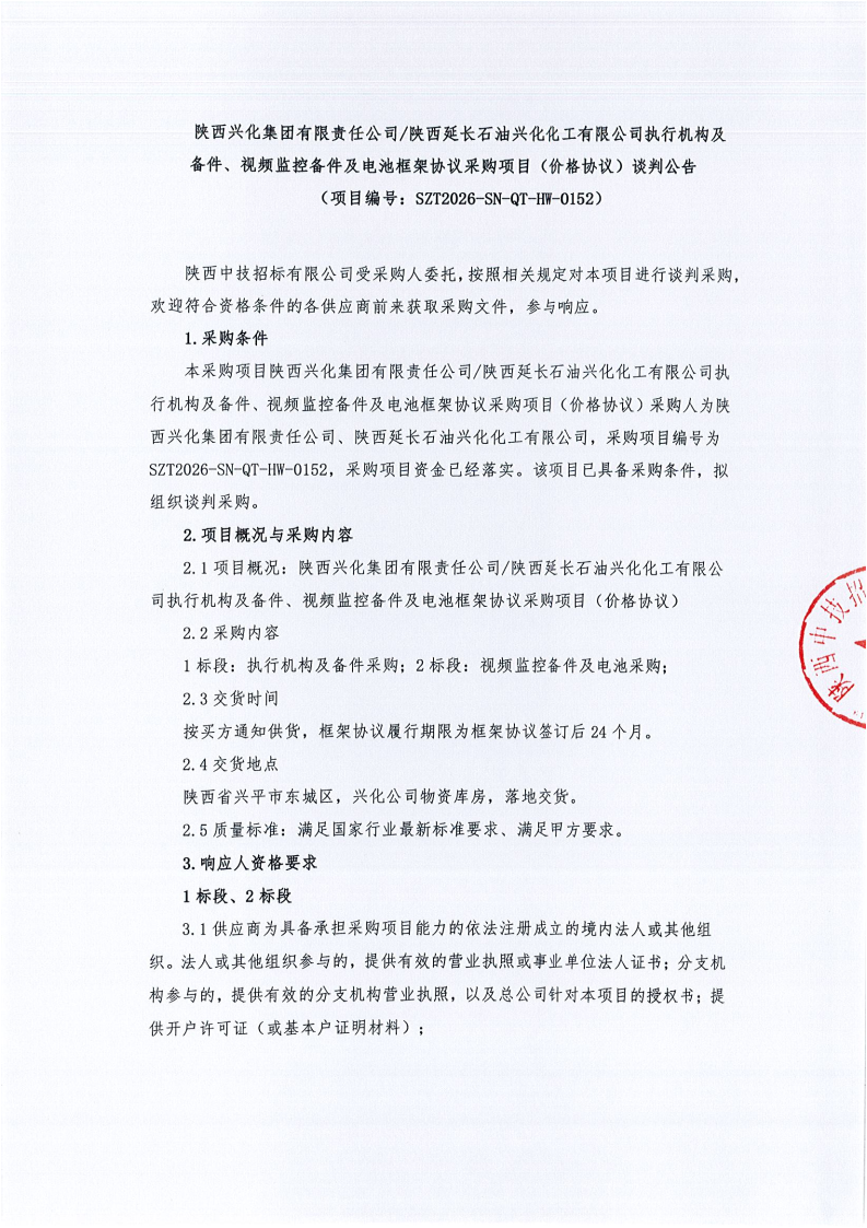 陕西兴化集团有限责任公司、陕西延长石油兴化化工有限公司执行机构及备件、视频监控备件及电池框架协议采购项目(价格协议)谈判公告