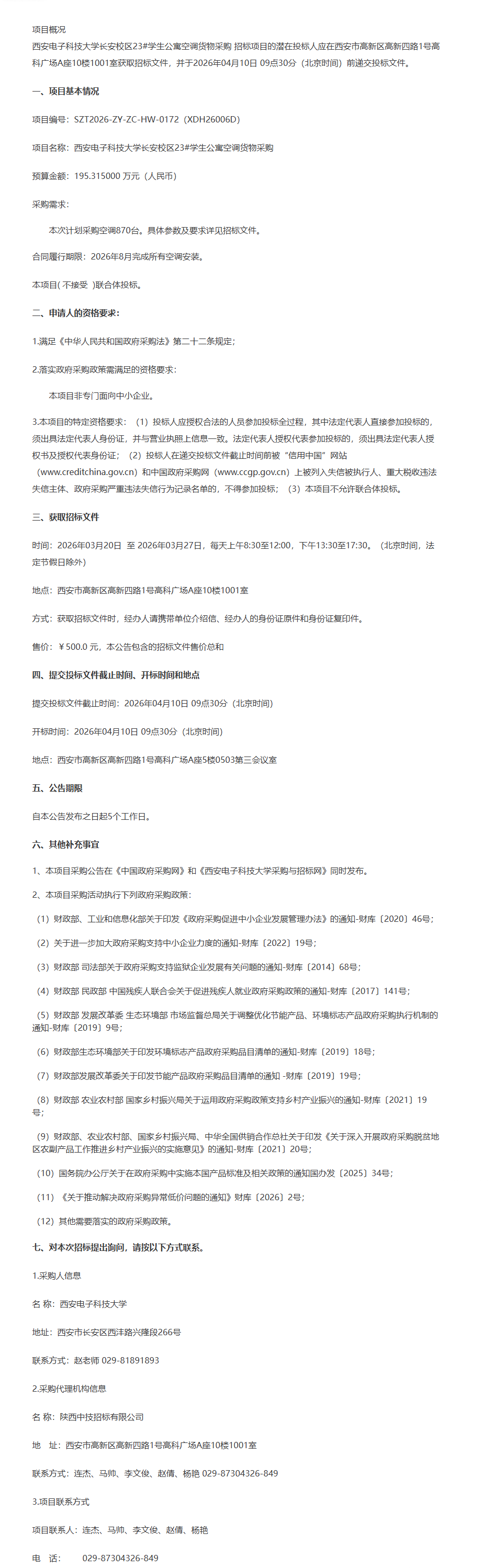 西安电子科技大学长安校区23#学生公寓空调货物采购公开招标公告