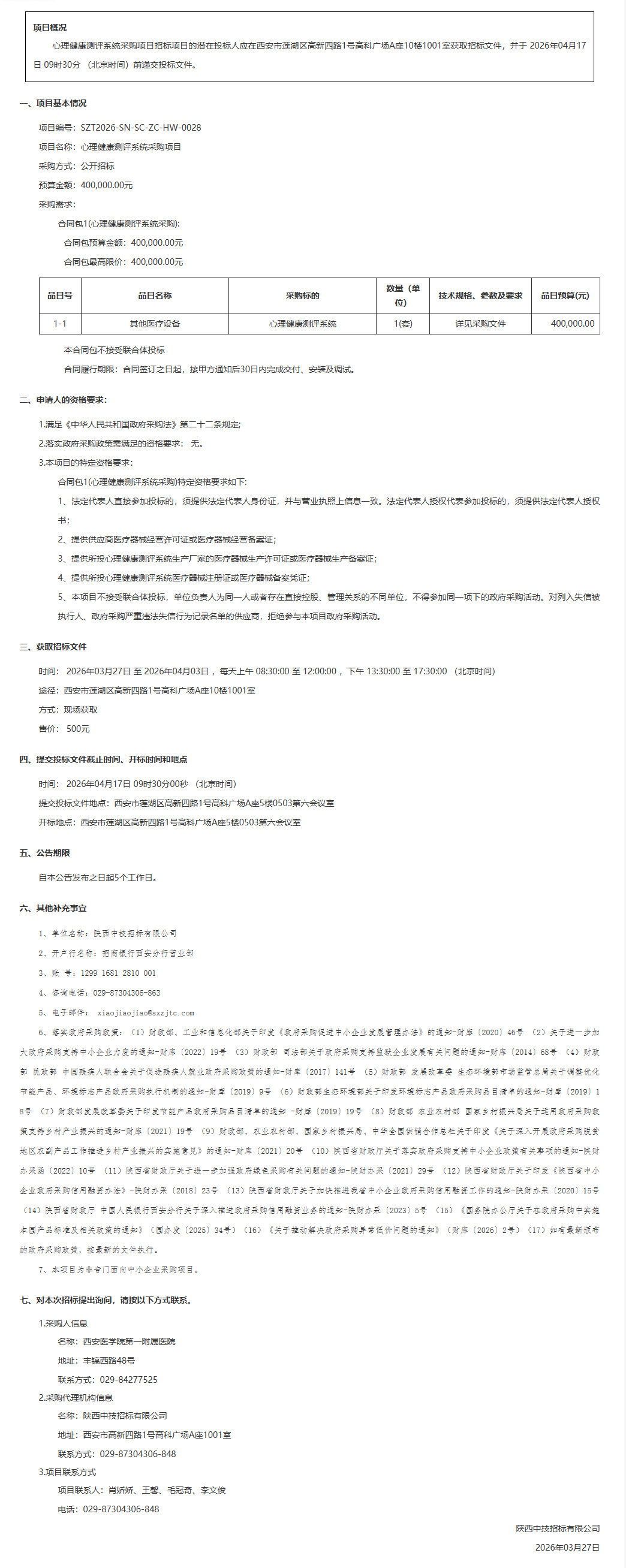 西安医学院第一附属医院心理健康测评系统采购项目招标公告