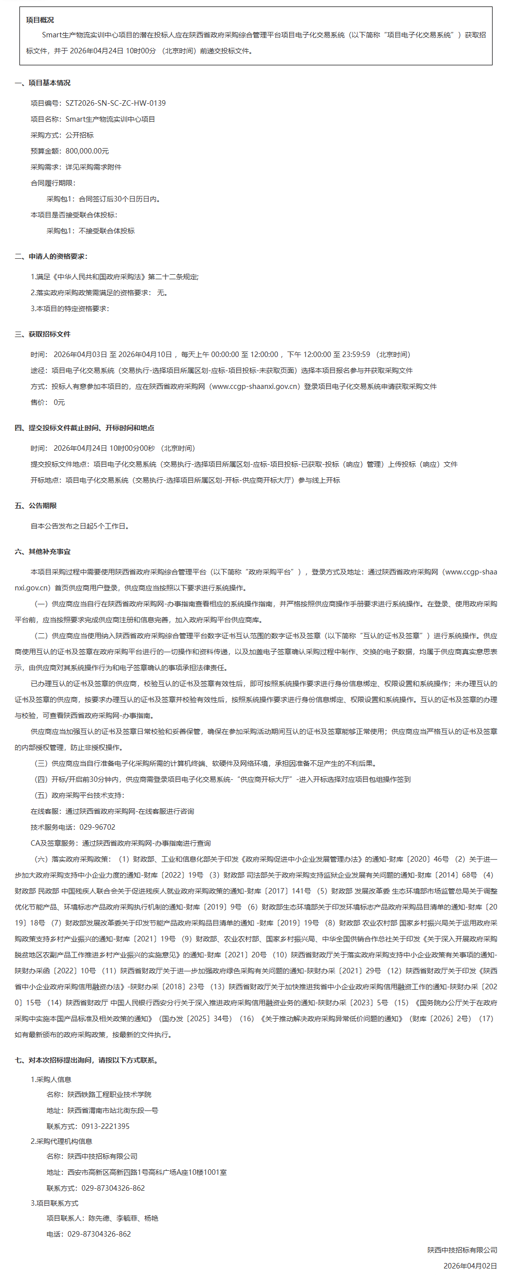 陕西铁路工程职业技术学院Smart生产物流实训中心项目招标公告