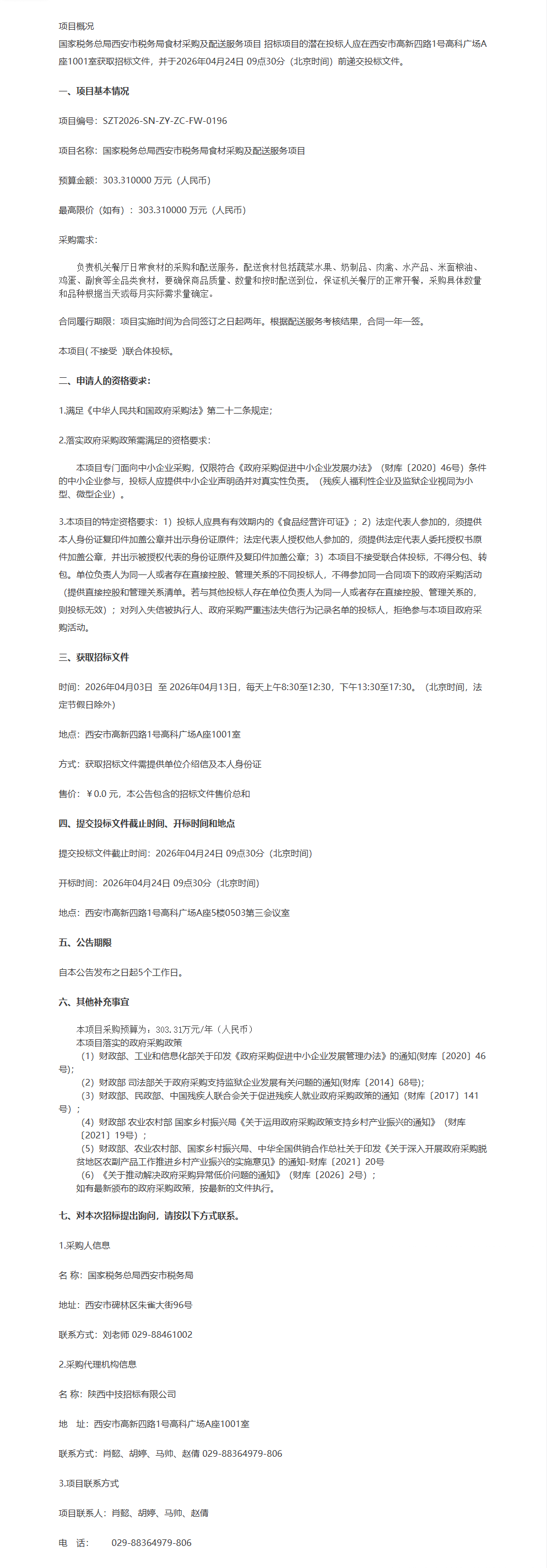 国家税务总局西安市税务局食材采购及配送服务项目公开招标公告