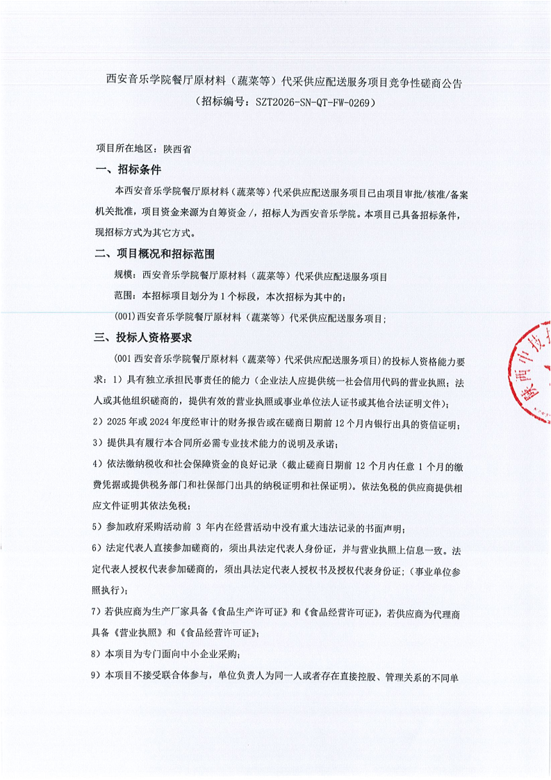 西安音乐学院餐厅原材料(蔬菜等)代采供应配送服务项目竞争性磋商公告