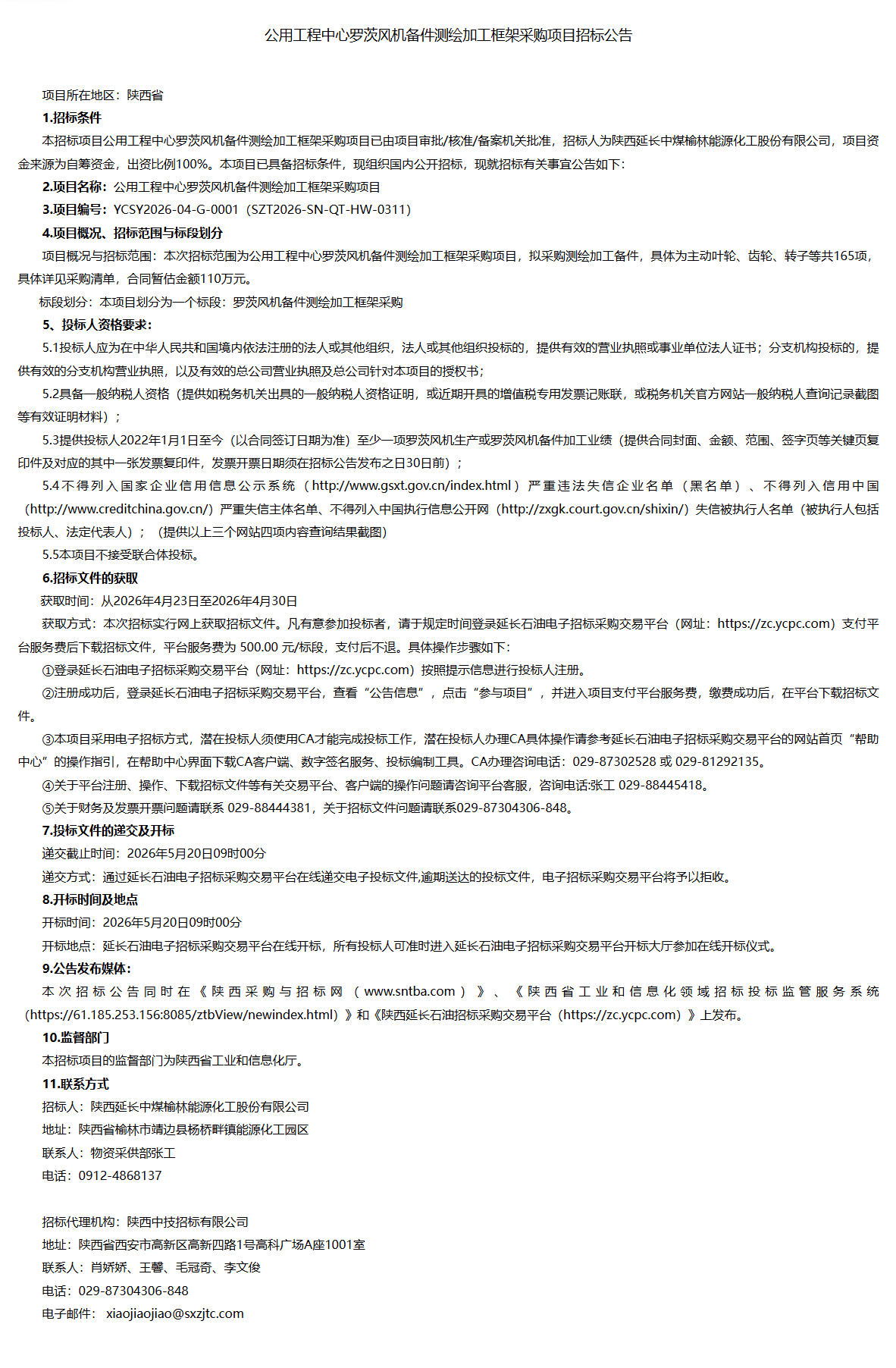公用工程中心罗茨风机备件测绘加工框架采购项目招标公告