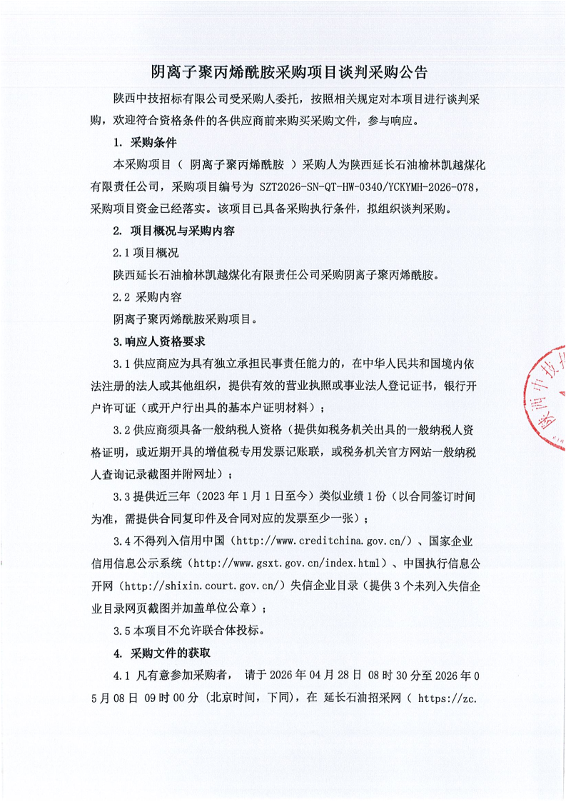 阴离子聚丙烯酰胺采购项目谈判采购公告
