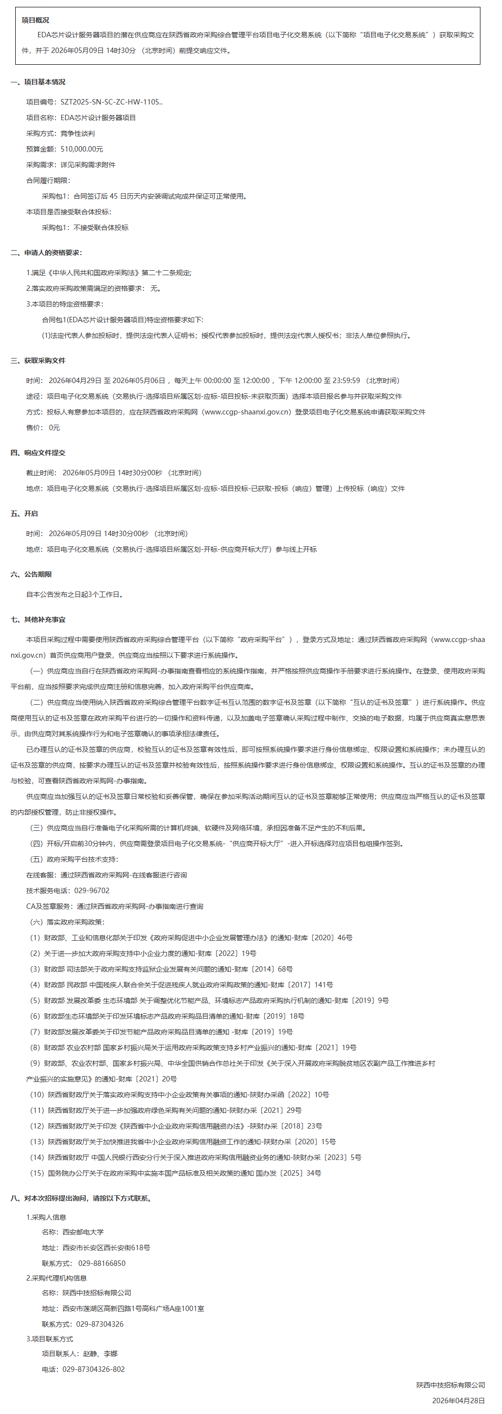 西安邮电大学EDA芯片设计服务器项目竞争性谈判公告