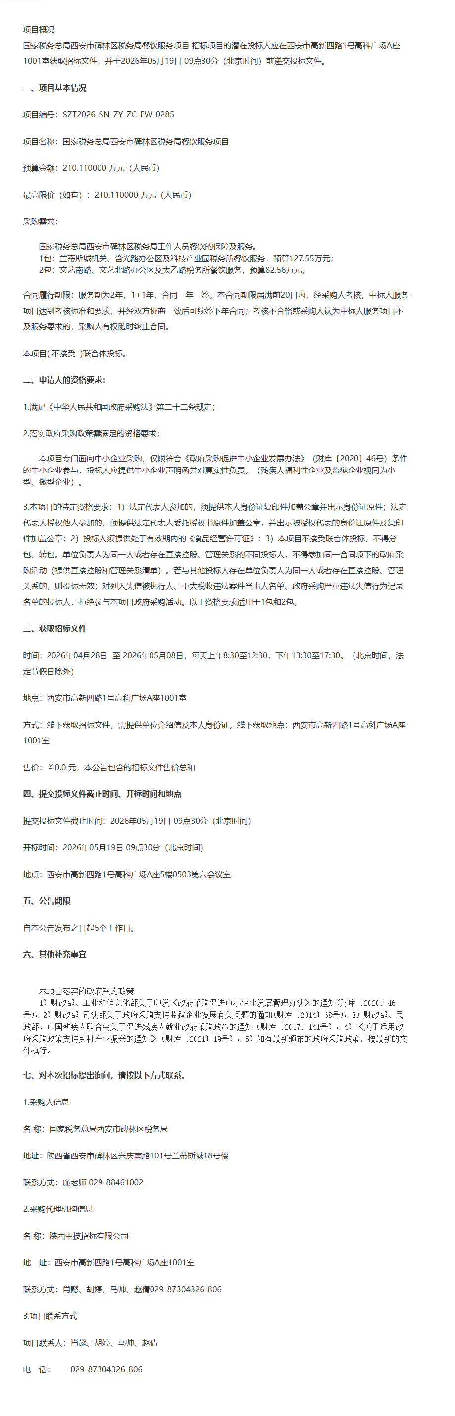 国家税务总局西安市碑林区税务局餐饮服务项目公开招标公告