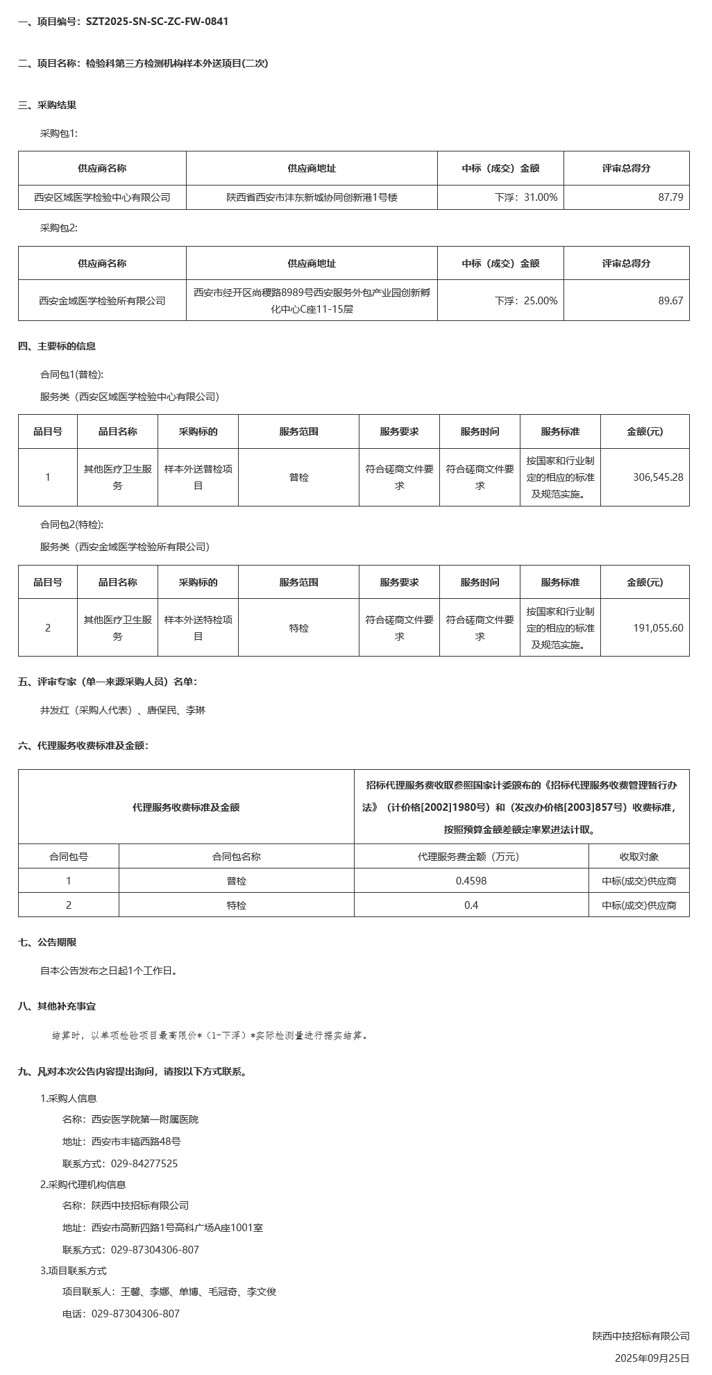 西安医学院第一附属医院检验科第三方检测机构样本外送项目(二次)中标(成交)结果公告