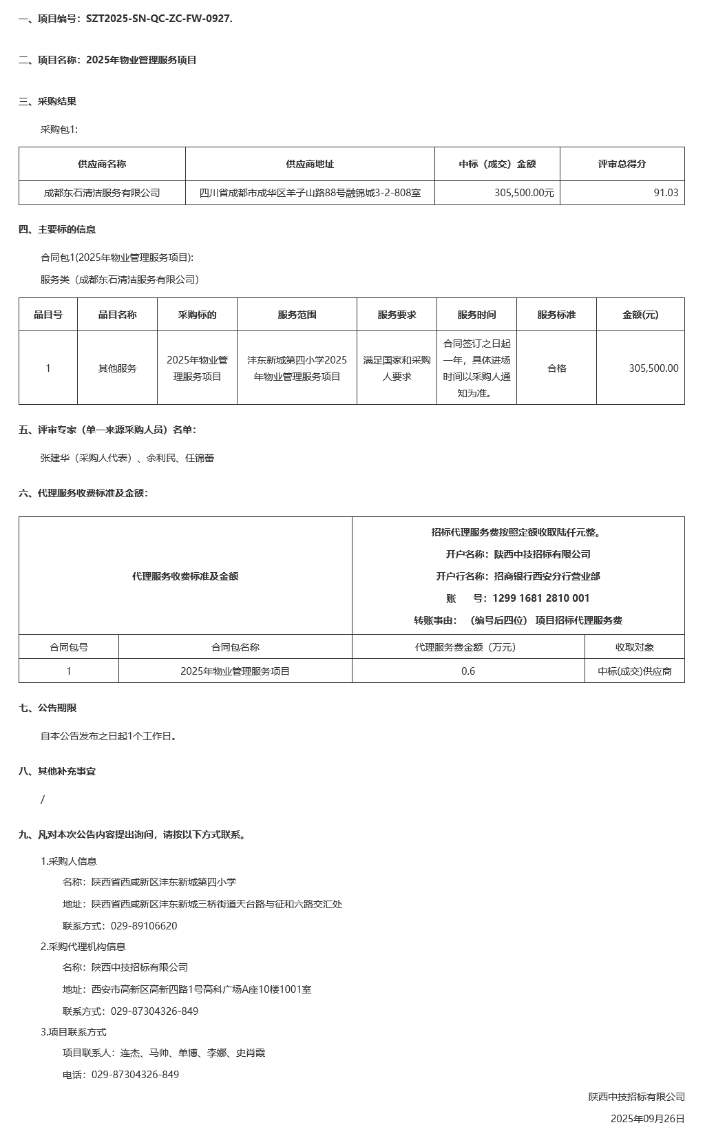 陕西省西咸新区沣东新城第四小学2025年物业管理服务项目中标(成交)结果公告