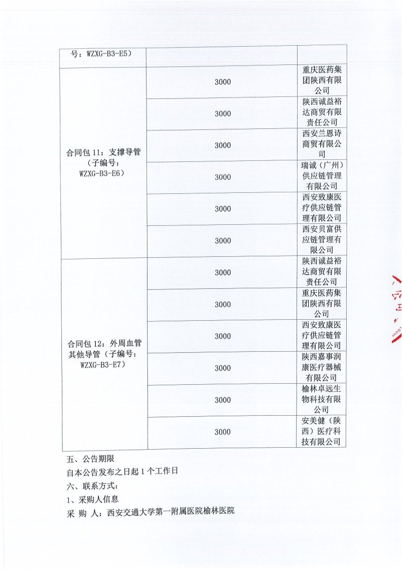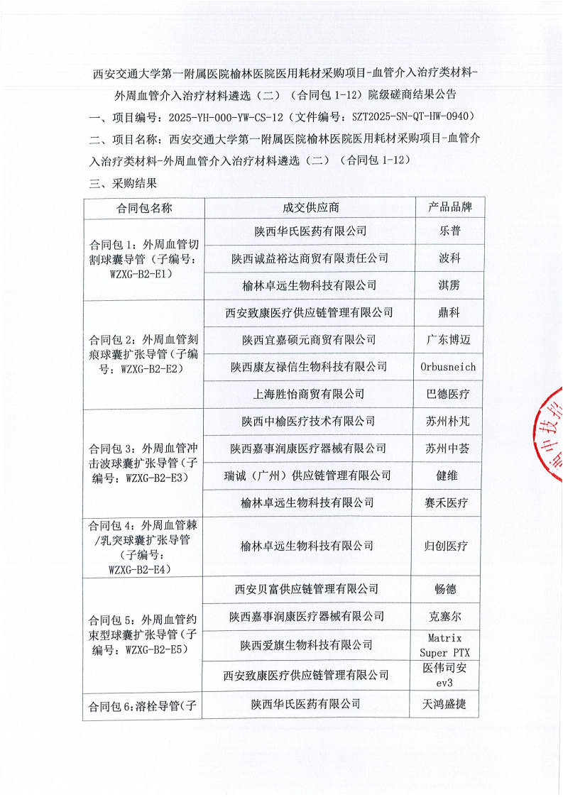 西安交通大学第一附属医院榆林医院医用耗材采购项目-血管介入治疗类材料-外周血管介入治疗材料遴选(二)(合同包1-12)院级磋商结果公告