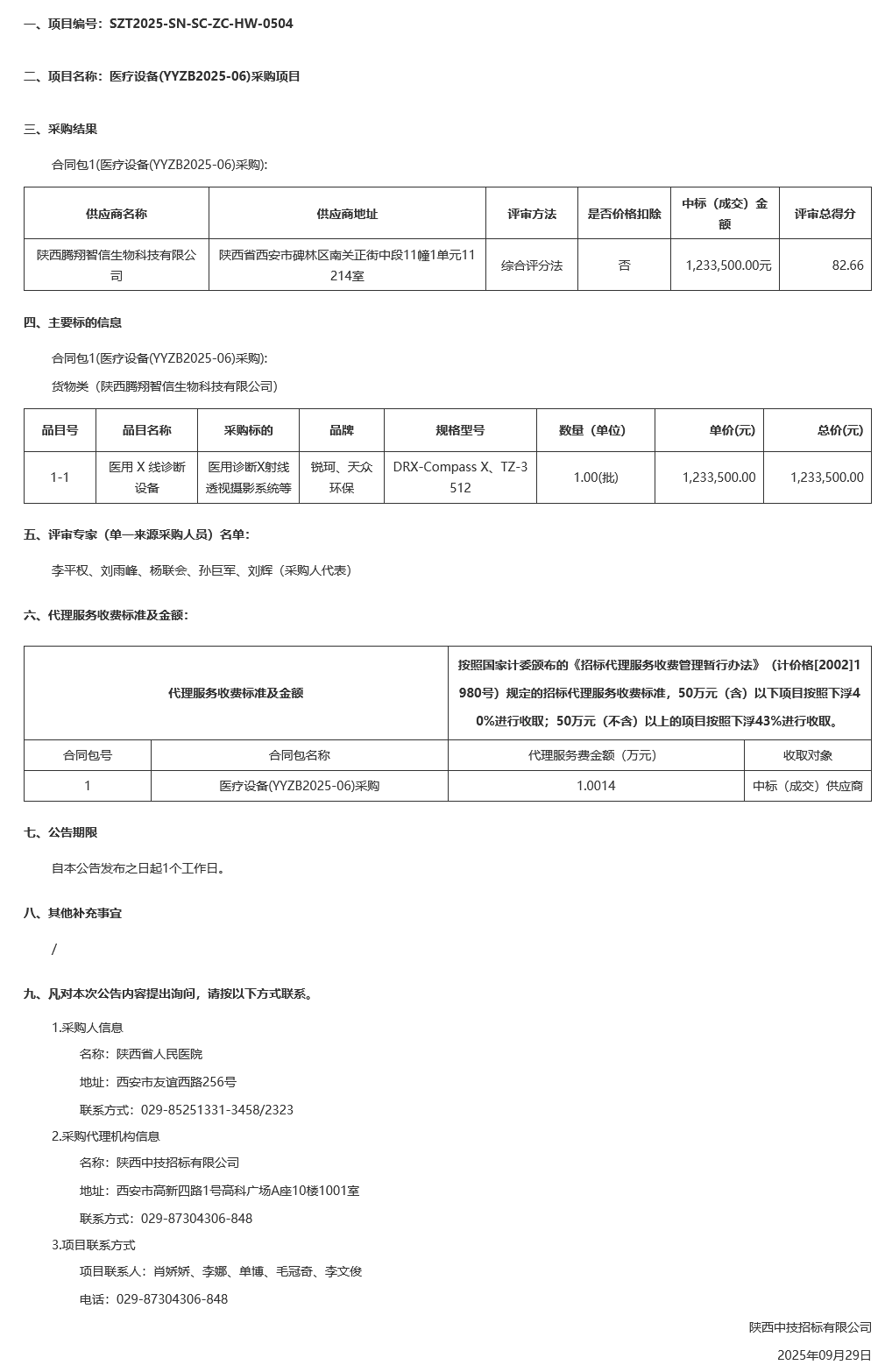 陕西省人民医院医疗设备(YYZB2025-06)采购项目中标(成交)结果公告