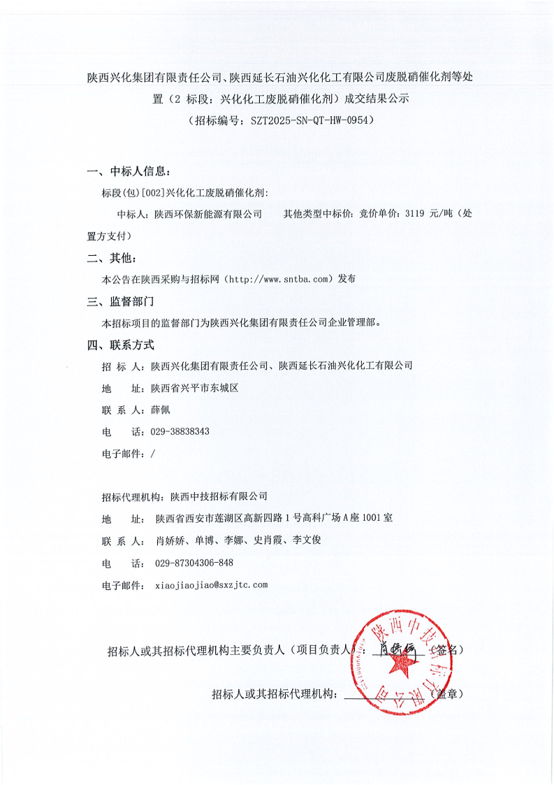 陕西兴化集团有限责任公司、陕西延长石油兴化化工有限公司废脱硝催化剂等处置(2 标段:兴化化工废脱硝催化剂)成交结果公示