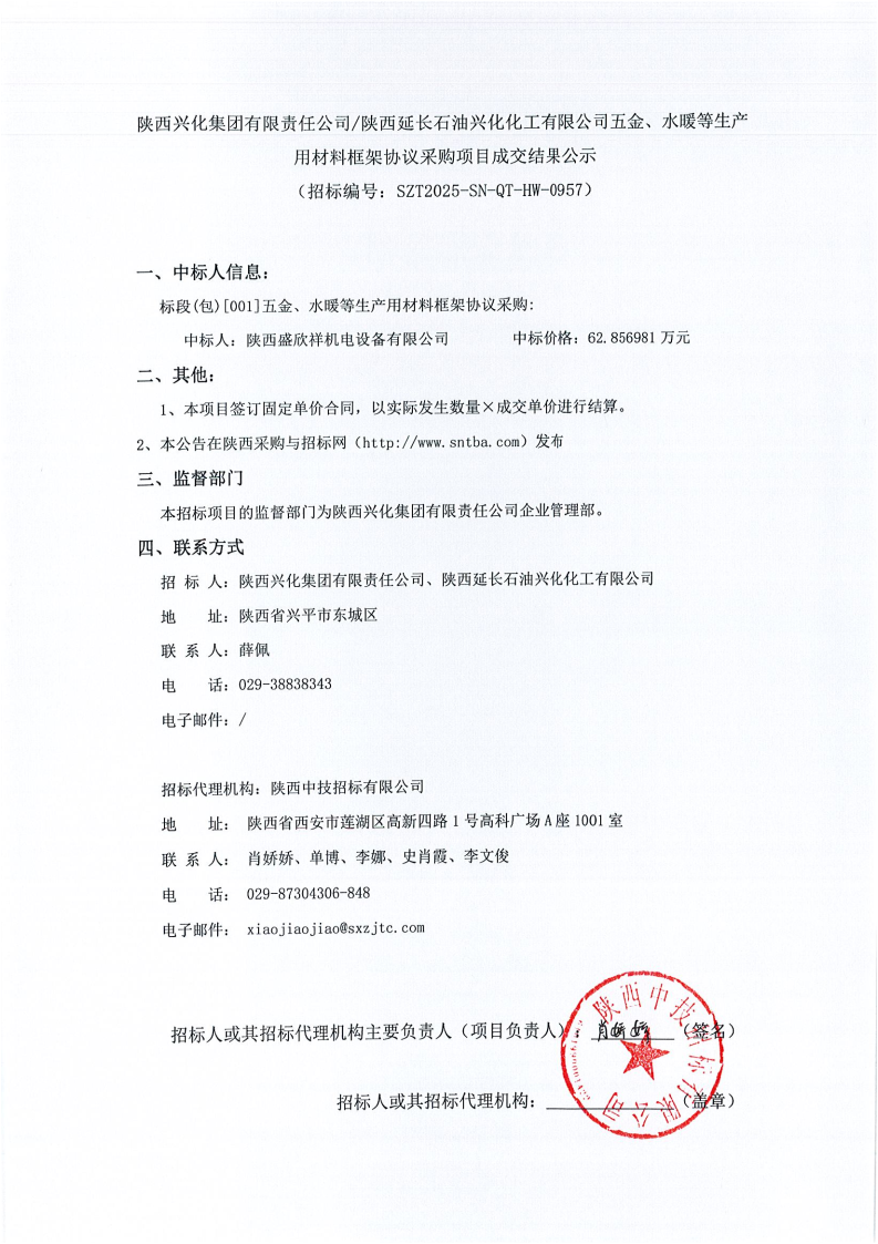 陕西兴化集团有限责任公司/陕西延长石油兴化化工有限公司五金、水暖等生产用材料框架协议采购项目成交结果公示