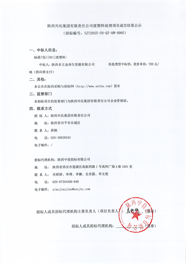 陕西兴化集团有限责任公司废塑料处理项目成交结果公示