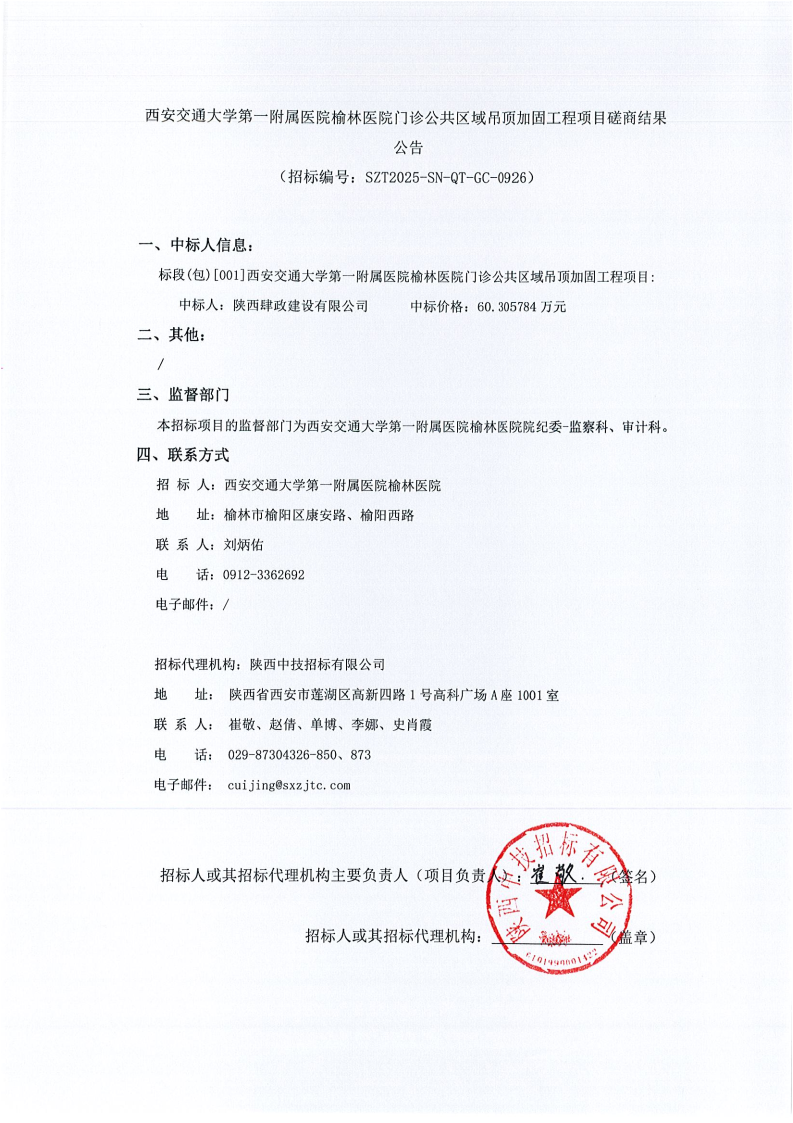 西安交通大学第一附属医院榆林医院门诊公共区域吊顶加固工程项目磋商结果公告