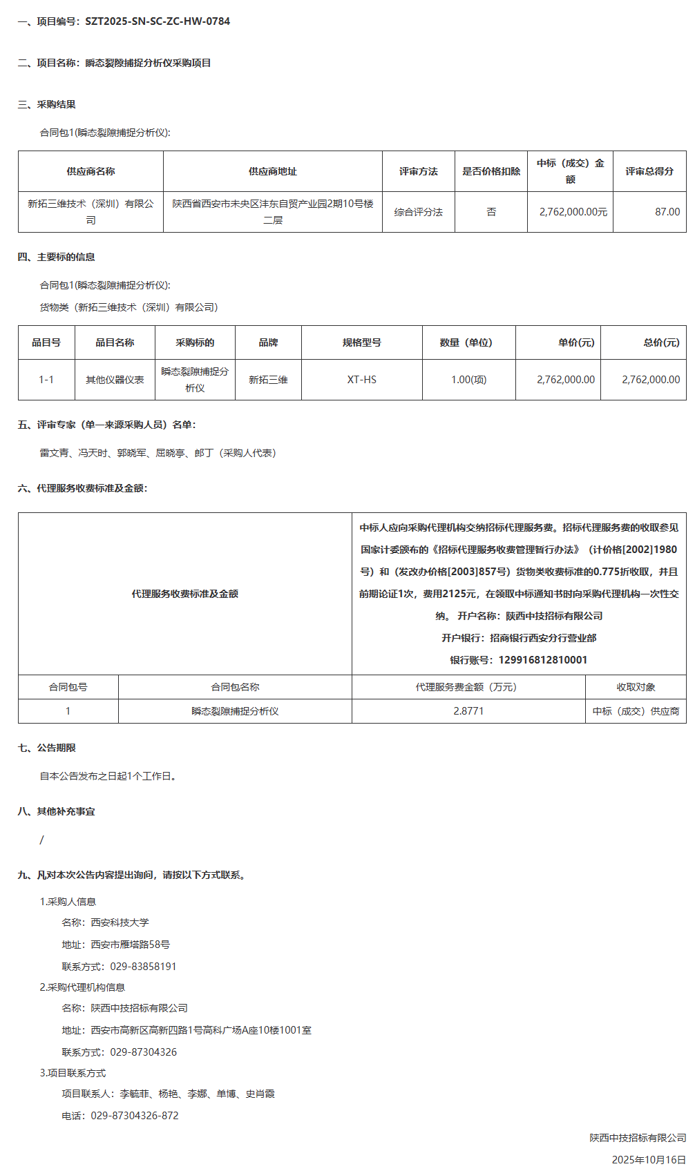 西安科技大学瞬态裂隙捕捉分析仪采购项目中标(成交)结果公告