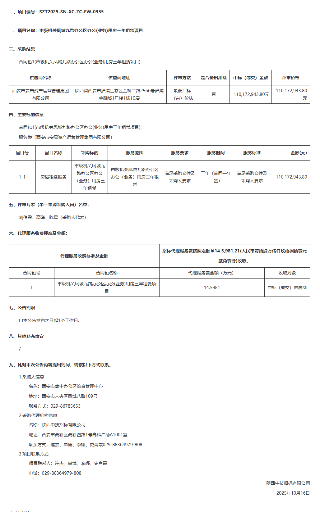 西安市集中办公区综合管理中心市级机关凤城九路办公区办公(业务)用房三年租赁项目中标(成交)结果公告