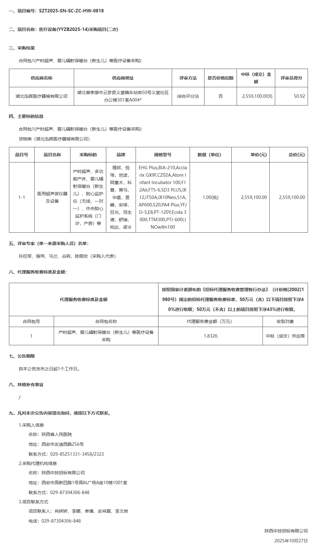 陕西省人民医院医疗设备(YYZB2025-14)采购项目(二次)中标(成交)结果公告