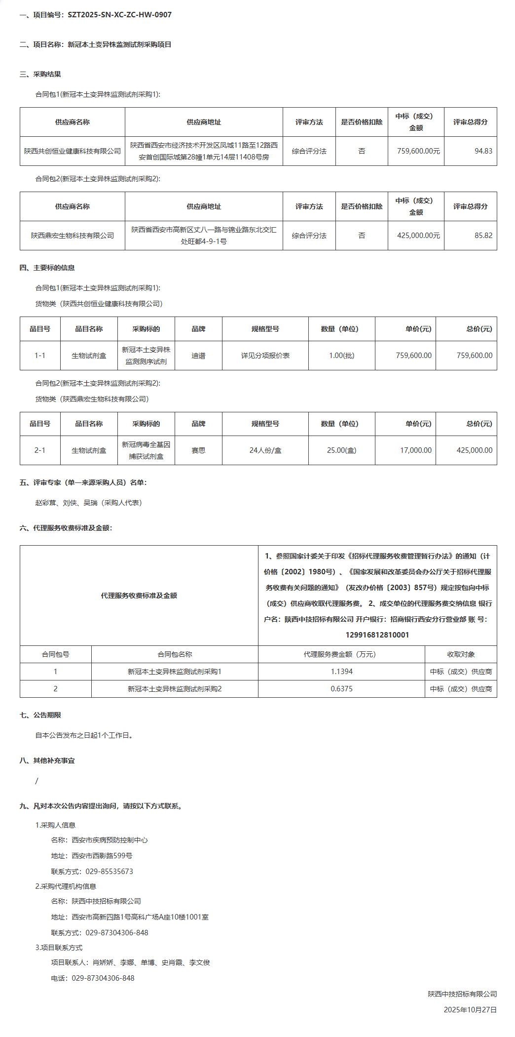 西安市疾病预防控制中心新冠本土变异株监测试剂采购项目中标(成交)结果公告