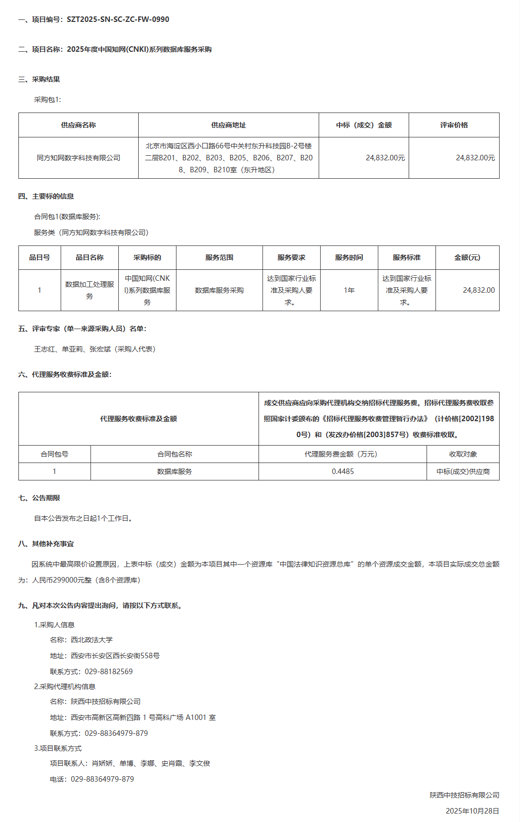 西北政法大学2025年度中国知网(CNKI)系列数据库服务采购中标(成交)结果公告