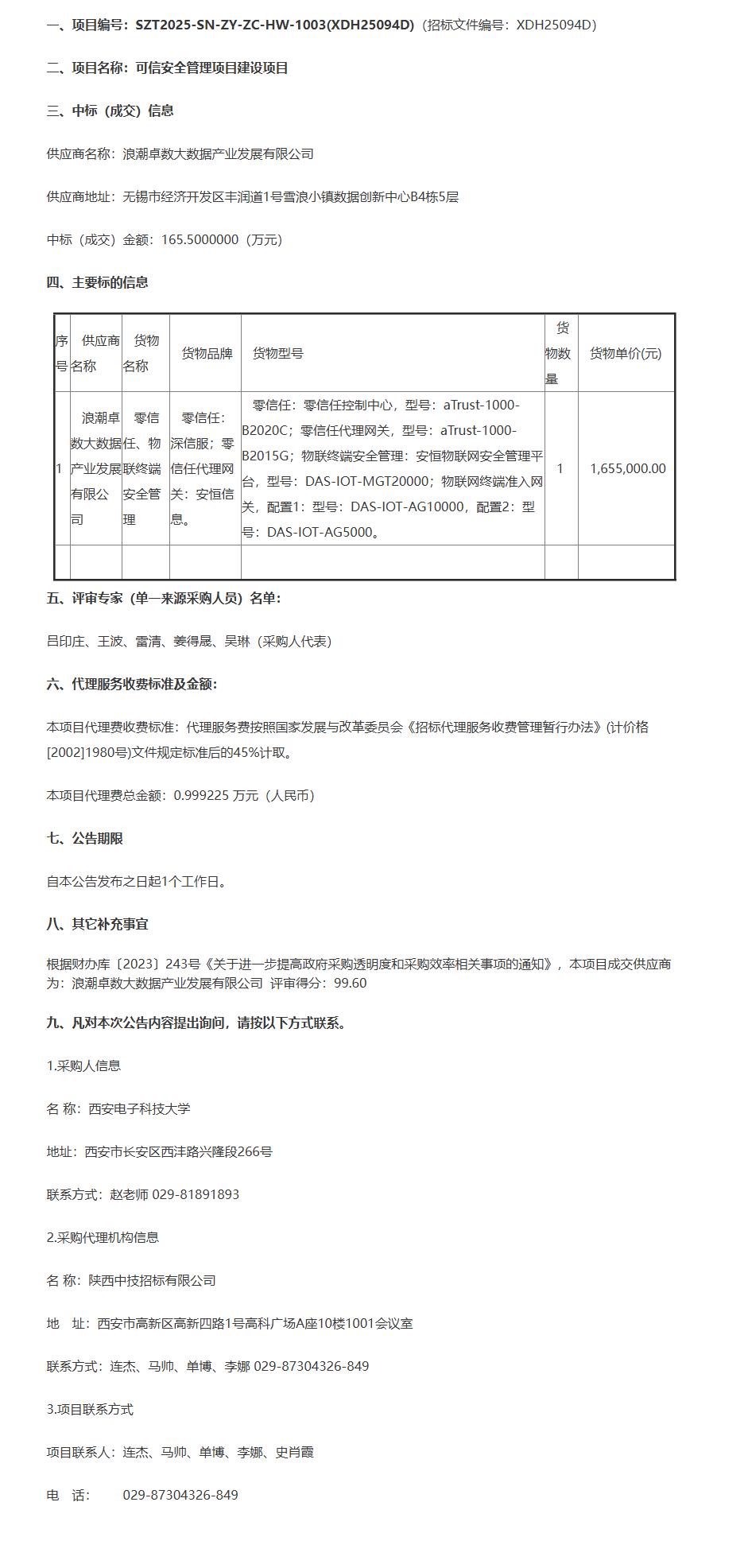 西安电子科技大学可信安全管理项目建设项目成交公告